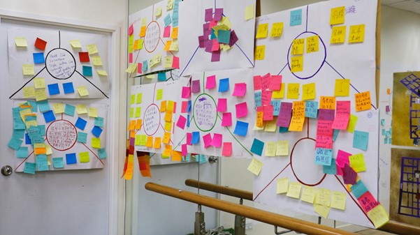 同時,其他的牆上貼上了滿滿彩色的便利貼,上面寫滿了三個主題會議的成果。