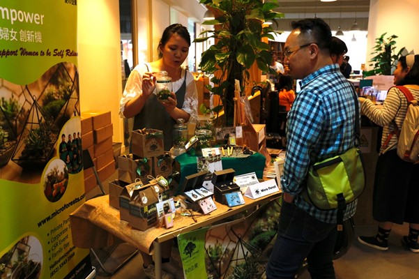 社企市集中的攤檔分別有推廣環保月經杯和環保手工皂的小刺蝟 happeriod及售賣環保護理品和一些在地生產食品的小而美俱樂部,還有Micro forest帶來由基層媽媽製作的藝術作品向參加者介紹。